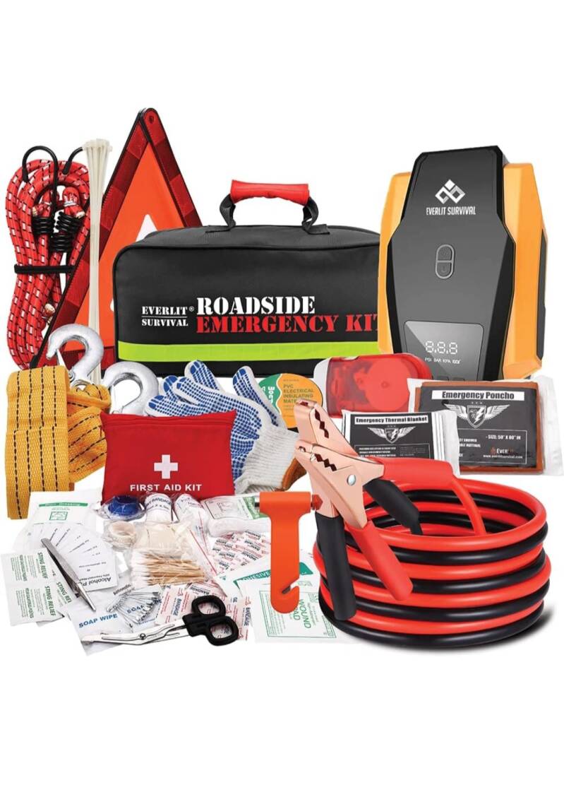- Emergency kits with road flares, flashlights, extra batteries, blankets, and non-perishable food.