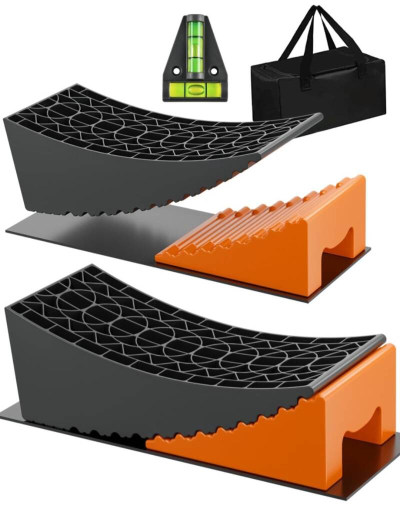 RV Leveling Blocks Ramp Kit, 2 Packs Camper Leveler System for Travel with Two Chocks, 2 Anti-Slip Mats, 1T Bubble Level and Carry Bag